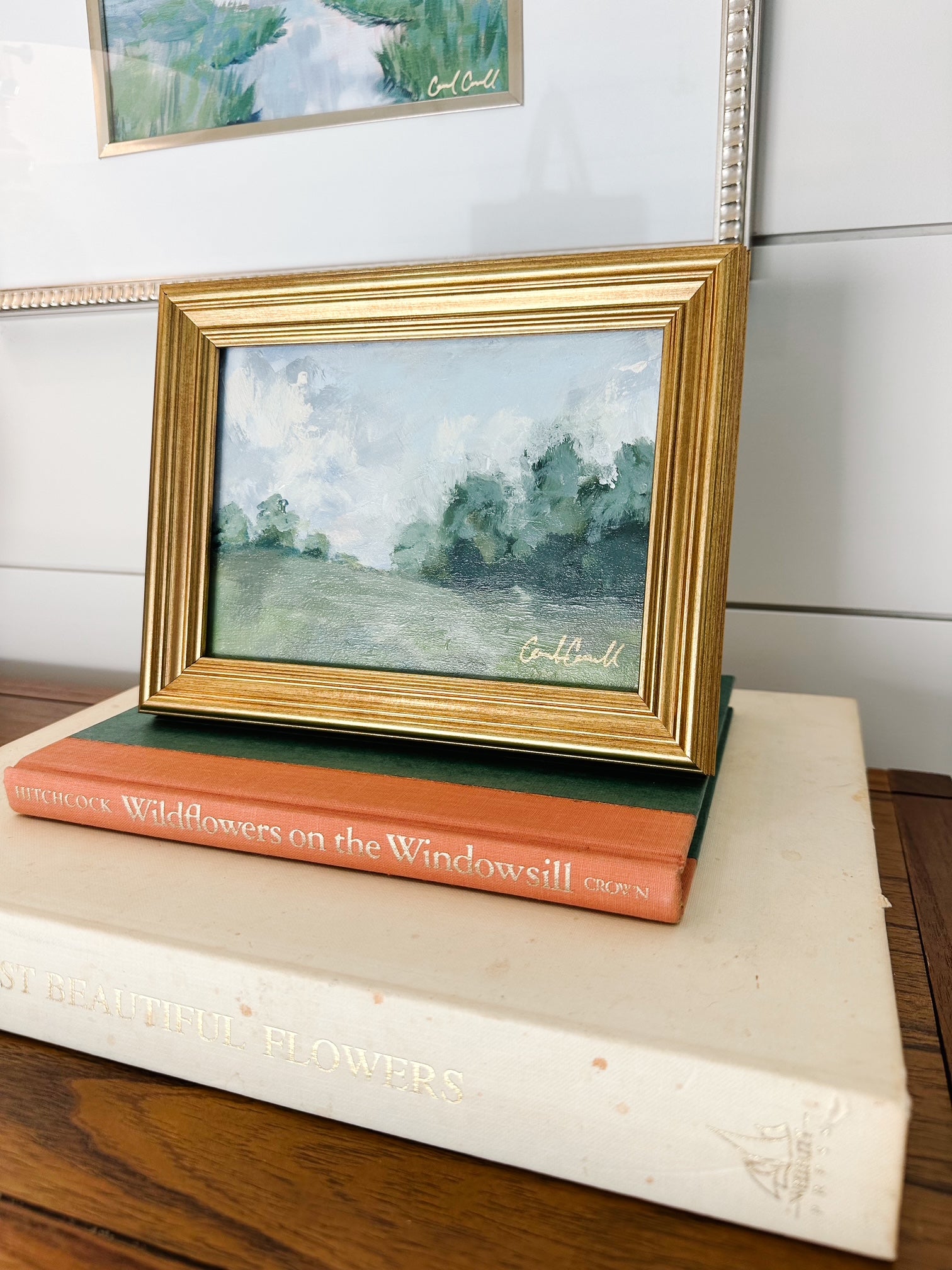 Painting is framed in golden frame to hang or stand alone.