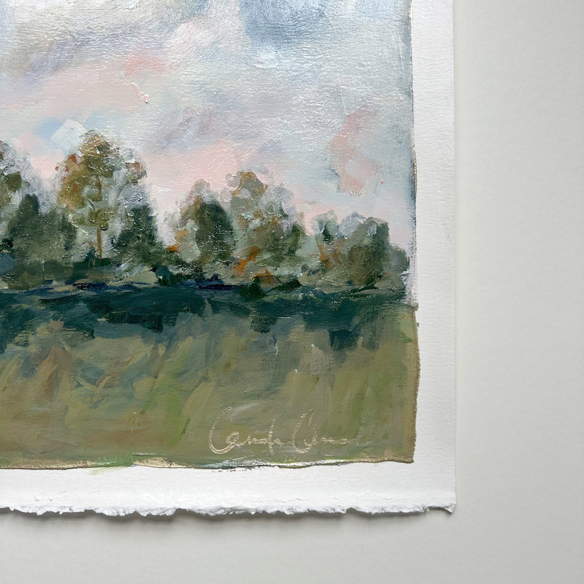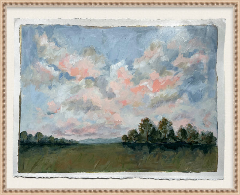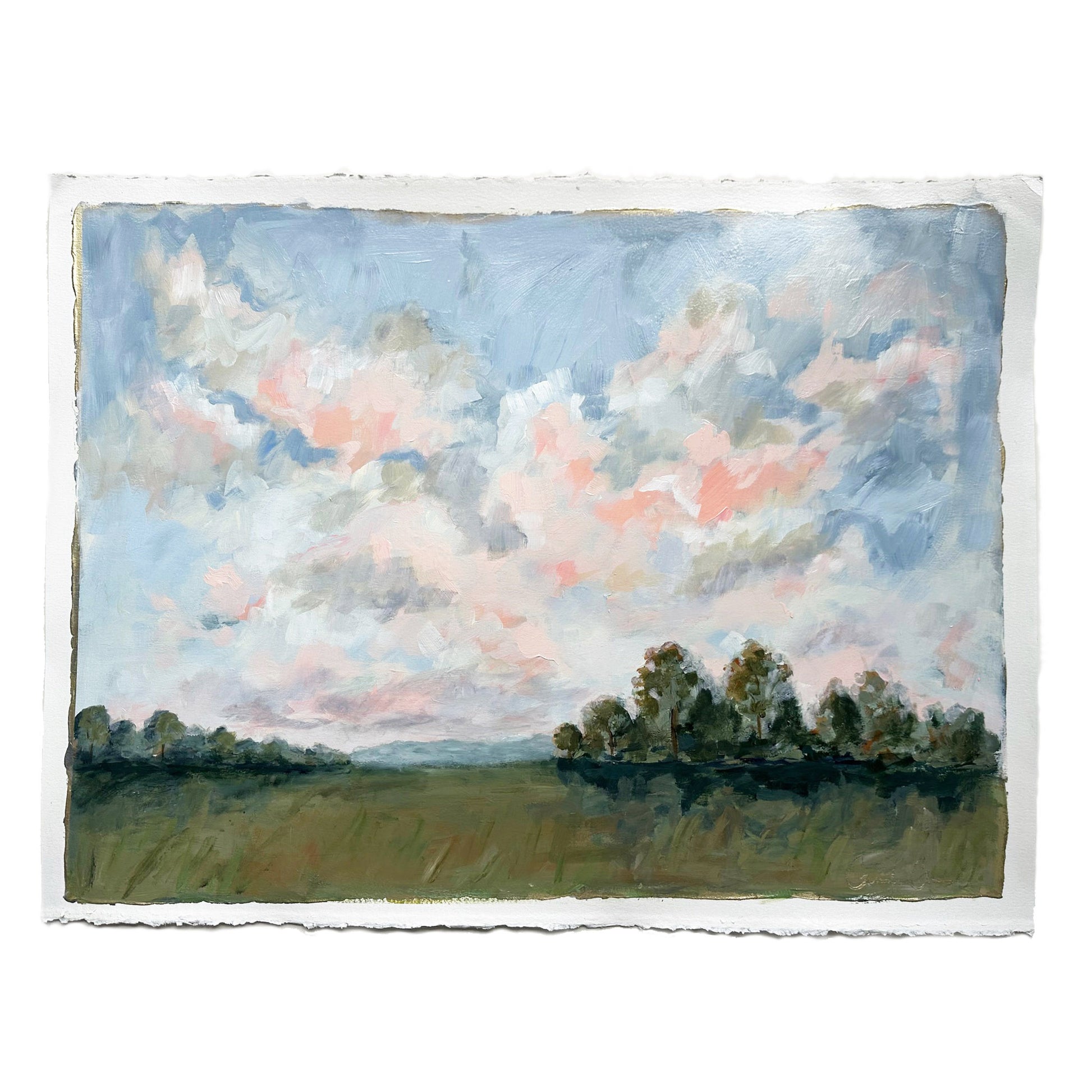An original acrylic landscape on paper, capturing the soft glow of evening light. Gentle greens stretch across the open field while clouds, brushed with pink and lavender, drift through a vast blue sky. This impressionist piece evokes a timeless sense of place, where land and memory meet.