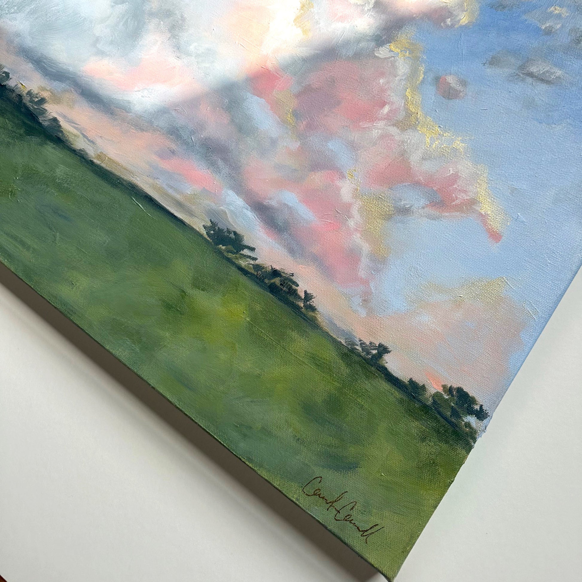 A sweeping sunset sky scattered with pink clouds highlighted with gold where touched by the sun. Below, the land stretches out in green meadows and distant trees.
